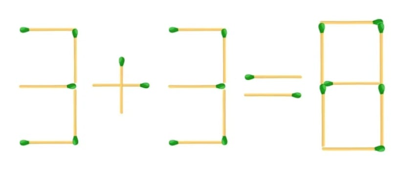 Pred mojimi očmi je nepravilna enakost, sestavljena iz vžigalic: 3+3=8. Zdi se skoraj nemogoče, da bi jo popravili, če ne moremo ničesar odstraniti ali dodati. Vendar pa rešitev obstaja in sploh ni očitna.