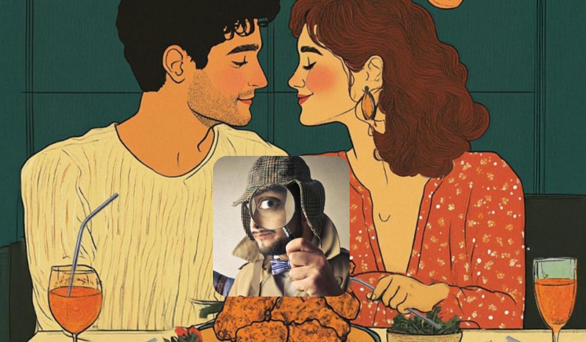 Pred vami sta zaljubljena moški in ženska, ki se med romantično večerjo prijetno pogovarjata. Dekle je oblečeno v elegantno obleko, moški pa v lahek pulover. Na mizi lahko vidite kozarce s pijačo in več okusnih jedi. Na stenah lokala visijo slike, s stropa pa so obešene žarnice.